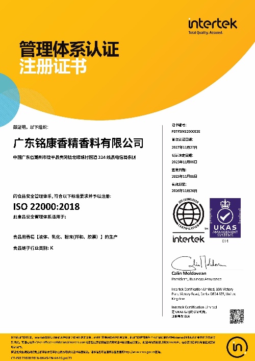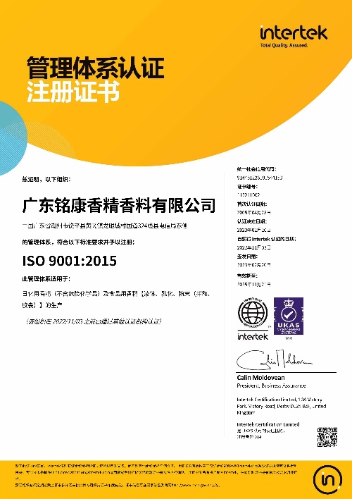多年來,銘康本著“科學發(fā)展、追求卓越”的企業(yè)宗旨,秉承“攜手共進、誠信共贏”的經(jīng)營理念,歷經(jīng)二十余載的不懈努力,已發(fā)展成為在中國香料香精行業(yè)知名度高、創(chuàng)新能力強、影響力大的品牌企業(yè),歷任“中國香精香料化妝品工業(yè)協(xié)會副理事長單位”、“香精專業(yè)委員會副主任委員單位”、“香料香精法規(guī)事務工作委員會副主任單位”、“科技工作委員會副主任委員單位”,是國家標準《日用香精GB/T22731-2017》主要起草單位,連續(xù)多年被評為中國香精香料行業(yè)十強企業(yè)。